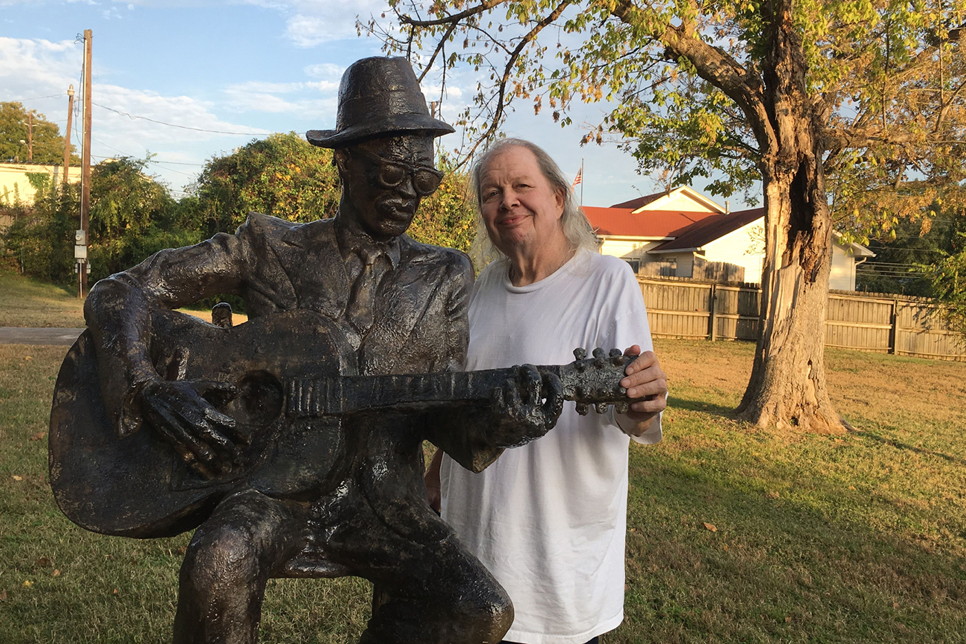 Tom Peterson meets the Lightnin' Hopkins statue by Jim Jeffries.